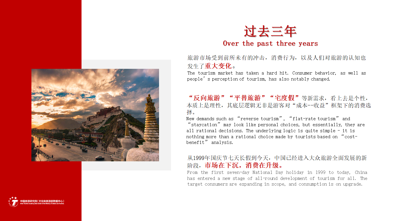 From the seven day National Day holiday in 1999 to today, China has entered a new stage of comprehensive development of mass tourism, with the market sinking and consumption upgrading. The changes in tourist demand and consumption behavior will inevitably affect the innovation of commercial supply and industrial momentum, thereby affecting the adjustment of industrial policies and regulatory systems. From a more macro perspective, China has completed the historical task of eradicating poverty and building a moderately prosperous society in an all-round way, and is comprehensively promoting the great rejuvenation of the Chinese nation with Chinese path to modernization. In this strategic context, the tourism industry requires new thinking and policies to effectively enhance market promotion, destination construction, public services, and industrial innovation levels.